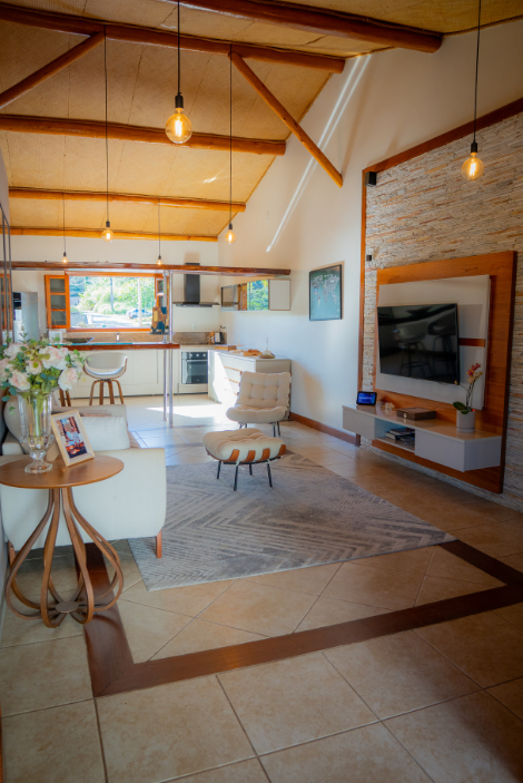 Chalé e casas equipadas com suítes, cozinhas completas e acabamentos modernos, pensados para conforto e elegância.